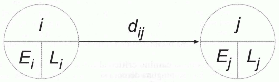 Figura 5.6 Representación de nodos y sus características: \(\mathbf{i}\) nudo de origen, \(\mathbf{j}\) nudo de destino, \(\mathbf{E}\) tiempo early, \(\mathbf{L}\) tiempo last y \(\mathbf{d}_{\mathbf{\text{ij}}}\) duración de la actividad