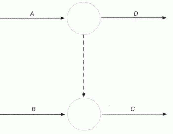Figura 5.3 Representación incorrecta (arriba) y correcta empleando actividades ficticias (abajo). Se supone que las actividades A y B preceden a la C y la actividad A precede a la D