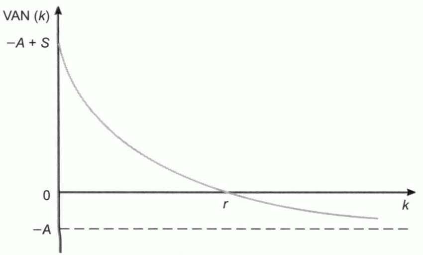 - Cuando \(k\) tiende a infinito, el valor actual neto tiende a \((- A)\), por lo que presenta una asíntota en esa altura.