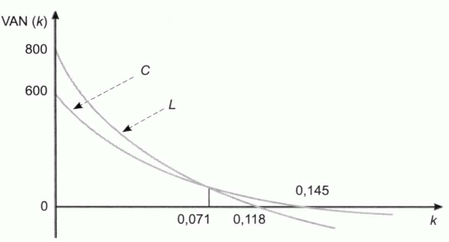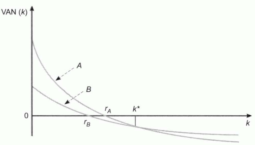- \(\text{VAN}\). También es preferible \(A\) porque su \(\text{VAN}\) es superior para cualquier tipo de descuento inferior a \(k^{*}\).
