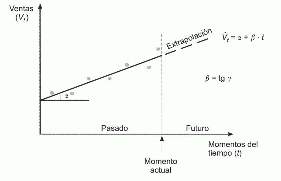 Modelos de extrapolación. Basados en la observación de tendencias regulares en el pasado y en la hipótesis de que se mantendrán en el futuro. Cuando las ventas varían de forma aproximadamente lineal en el tiempo, puede ser útil la regresión lineal simple de las ventas \(V_{t}\), sobre el tiempo, con arreglo a la ecuación de regresión: