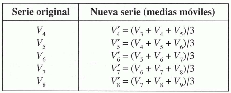 Para eliminar las variaciones esporádicas o accidentales de las ventas se utiliza el método de las medias móviles, consistente en sustituir el valor del periodo correspondiente, \(V_{t}\), por la media aritmética de este valor y otros que le son próximos. Por ejemplo: